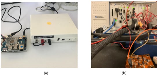(a) Wi-Fi experiment setup with Power monitoring tool. The Odroid board is connected to a low voltage power monitor tool from Monsoon Solution; (b) flexible prototype experiment setup with NI-DAQ machine.