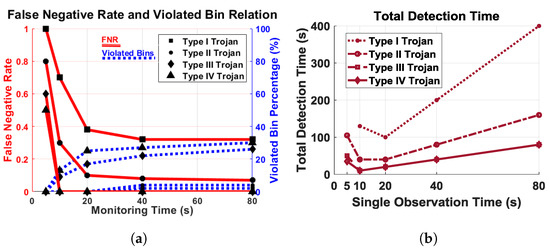 As seen in Figure 11a, the red lines show a false negative rate of Trojans, and the blue lines depict the minimum violated bin percentage. The percentage of minimum violated bin is flat if we go beyond 20 s of monitoring time. The number of bins over the self-referenced threshold does not linearly increase with monitoring time. Figure 11b plots the total detection time with respect to the duration of a single observation to evaluate the cost of testing, based on the number of tests required to detect unauthorized activity. In order to make sure the system is secure, the confidence level is set to 99% for completely automated malicious activity detection. The detection time decreases up to 20 s of observation, but increases after that.