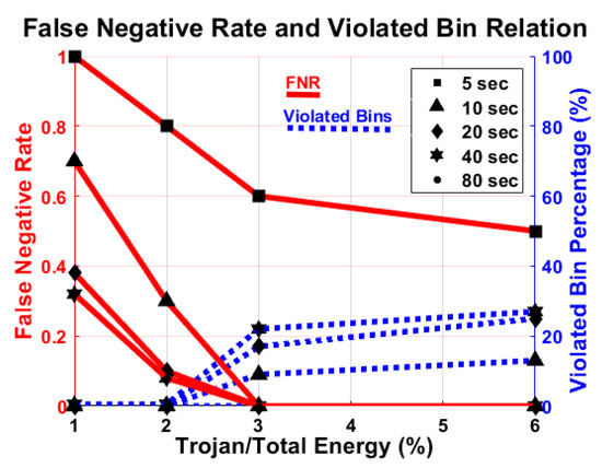 Power consumption by malicious activity is minimal compared to the rest of the activity of the original system. In particular, we focus on determining the smallest detectable Trojan, i.e., the lowest energy that a Trojan may have and still be detected, using one of these four types of malicious activities that are randomly enabled with various activity duration. We run the Trojans on a standalone basis 1000 times and take the average of the total determined energy to calculate the energy of the Trojans. As seen in Figure 12, the false negative rate is drastically reduced when the Trojan energy increased from 1% to 2%, and we reliably detect the Trojan if it is 3% or more of the total energy of the system. In addition, the percentage of violated bins significantly increases when the Trojan energy increases from 2% to 3% but does not change much after that.