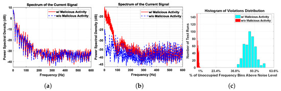 We performed 500 different experiments, with and without malicious activity. For each experiment, the IoT device is driven into a periodic steady state for approximately 30 s by sending repetitive Wi-Fi messages. We apply the noise threshold explained in Section 4, and count the number of frequency bins above the noise level, which are referred to as violations. The histogram of the number of violations is depicted in Figure 13c. We can observe that the spectrum without malicious activity had a significantly lower number of violations as expected. In fact, there is a very clear separation between the histograms of spectrum violations with and without malicious activity.