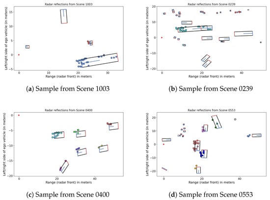 Samples with radar reflections (3 sweeps) and vehicle contours from selected scenes.