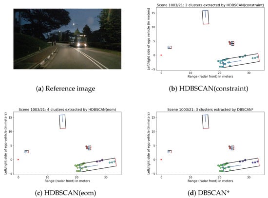 For scene 1003, with an oncoming bus and pedestrians (see Figure 2a), constraint-based HDBSCAN performs better than unsupervised HDBSCAN and DBSCAN* because it selects the entire bus as a cluster. For DBSCAN*, the fixed epsilon value of 4 is not large enough to include all parts of the bus (Figure 2d), and HDBSCAN(eom)’s stability measure (Figure 2c) also leads to separate clusters. Note that although 1003 is the only night scene out of the four scenes, this does not affect the clustering—as mentioned earlier, radar data is very robust to environmental influences, including lighting conditions. Orientation of the object to the sensor plays a larger role in this case: we have a rather dense point cloud at the front of the vehicle, but only few detection points at the rear and in particular on the side that is facing away from the sensor. This variation in density makes it more difficult to cluster all parts of the bus as one object.