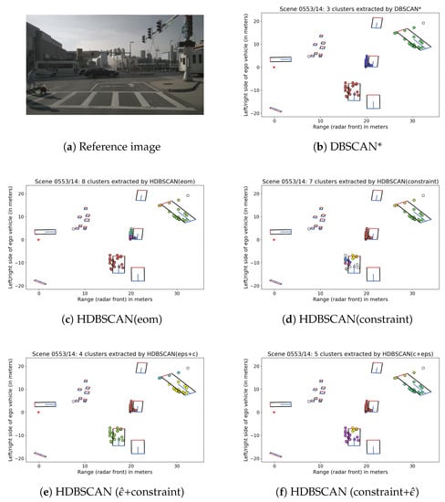 We applied our constraint-based selection method to radar data sets from four exemplary traffic scenes, based on the unsupervised construction of HDBSCAN hierarchies with low minimum cluster size. The method showed promising performance despite being based on very simple constraint definitions. In one scene, a micro-cluster effect was observed that derived from the low minimum cluster size and the application of constraints that were not yet relevant at this level of the hierarchy. However, this problem could be resolved by a combination with HDBSCAN(). Another limitation was that too many cluster candidates were merged for cars driving in the same direction with similar velocity. To avoid this issue, a refinement of constraint definitions or the integration of additional background knowledge is required, although this can be difficult to achieve in automotive radar data sets where the environment is constantly changing.