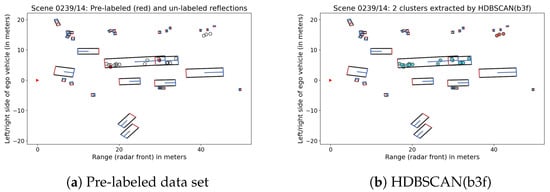 Figure 4 demonstrates the possible effect of pre-labels for a frame in Scene 0239. The pedestrian group in the background was clustered in an unsupervised way, but the two pre-labeled data points from the large truck (highlighted in red in Figure 4a) were enough to guide HDBSCAN(b3f) to the selection of the entire truck as one cluster, whereas HDBSCAN(eom) would have chosen separate clusters. On the other hand, the presence of two or even more pre-labels in only one part of the truck would not have improved the result. This illustrates the huge challenge of providing appropriate pre-labels for radar measurements, which is the reason why we instead focused on a cluster-level approach.