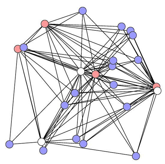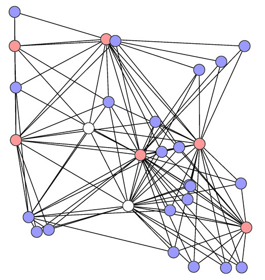 In the study, we consider irregular networks that were generated by [38] of three different sizes: small networks with 18 nodes, medium networks with 24 nodes, and large networks with 30 nodes. In each network, the nodes were placed in a given square area according to the uniform distribution. The size of the network area is equal to 220 m × 220 m, 250 m × 250 m, and 280 m × 280 m, respectively, for small, medium, and large networks. Each small networks has two sensors and 10 destinations, each medium network has four sensors and 16 destinations, while each large network has six sensors and 22 destinations; all of the remaining nodes in each network serve as purely transit nodes. Figure 1, Figure 2 and Figure 3 show the example networks. The sensor nodes are depicted in red, destinations in blue, and transit nodes in white.