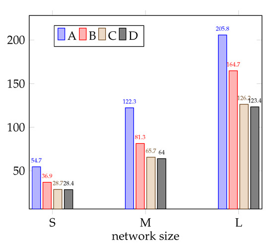 Table 6, Table 7 and Table 8 present the averaged results illustrating time efficiency of the optimization model for small, medium, and large networks. The meaning of the letters A, B, C, and D in the columns’ headers is the same as in the previous section. Additionally, the unit of the frame size remains the same, i.e., all of the frame sizes are expressed in the number of time slots (note that, in the case of the linear relaxation of the problem, the number of time slots does not have to be integer).