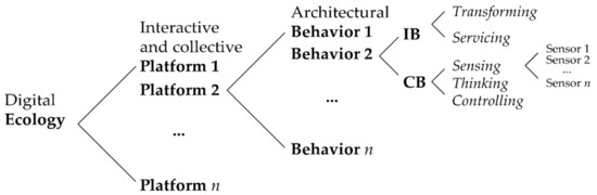 In summary, as architecture becomes a form of service or behavior, the surroundings can be conceptualized as software rather than hardware. Thus, “process replaces product in importance, just as system supersedes structure” [157]. Inhabitants of the digital ecosystem actively or pervasively participate in the interactive process of smart environments, which conveys self-organizing architectural behaviors. This type of IB can impact on individuals, communities and cultures linked through myriad sensory devices in a dynamic environment, developing “architectural responsiveness” [158]. Such IB relies on ambient recognition and intelligence to collect human activities and environmental data [159], presenting an augmented space, or so-called “sensponsive architecture” [43]. In addition, smart environments do not just enable individuals’ interactions with their surroundings, but also support social CBs with the physical environment. Data recording CBs in the digital ecosystem has been linked to reflexive collective intelligence [160]. Thus, IBs and CBs captured in this paper are essential for future architecture because they are central to understanding smart environments as continuously evolving, digital platforms.