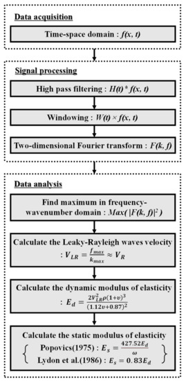 For air and concrete, the density ratio between and is approximately 0.0005, with values of 1.225 and 2400 kg/m3 for air and concrete, respectively. With the minimal ratio, the velocity difference between Rayleigh and leaky Rayleigh waves is less than 0.5% [18]. Therefore, the relation between the Rayleigh wave velocity and material properties can be used in the case of air and concrete. In this study, the velocity of leaky Rayleigh waves measured in air was used to calculate the dynamic modulus of concrete without losses. The dynamic modulus of concrete can be back-calculated based on Equation (4):