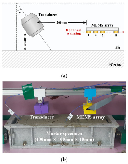 Testing setup of contactless ultrasonic method: (a) conceptual diagram, (b) photo of experimental setup.