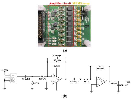 Details of developed sensor array: (a) 8 ch-MEMS array, (b) designed amplifying circuit.