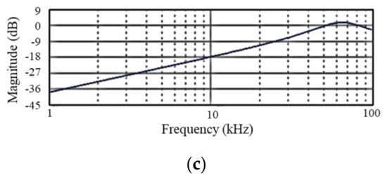 where and represent the resistances connected in series and parallel, respectively. The and used in the circuit are 4.7 kΩ and 100 kΩ, and the corresponding output voltage becomes approximately 20 times the input voltage. In addition to amplification, the circuit acts as a low-pass filter because voltage increases as frequency decreases. As signals through the OP-AMP may generate a low-frequency direct current (DC) offset, an additional capacitor was installed to remove this. Ultimately, the signals passing through the electrical circuit exhibited the highest sensitivity at 50 kHz and were amplified approximately 2000 times. The phase of the signals is the same as that of the initial phase using two inverting amplifiers. The sensitivity of each filter design in frequency domain is presented in Figure 6.