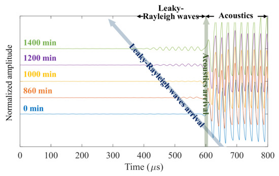 Leaky Rayleigh waves were measured in mortar specimens using the contactless ultrasonic method. As described in Section 2 (joint-half space between liquid and quasi-solid), the leaky waves are not measurable at the beginning of hydration. Thus, the waves were initiated at a certain time when the mortar became solid. The example time signals from OPC 0% are presented in Figure 7, where a series of A-scans were obtained from the first sensor among the arrays. The initiation of leaky Rayleigh waves was approximately 800 min after the addition of water. Then, the arrivals of the leaky waves increased as the mortar hardened. The developed amplifying circuit and sensor array clearly captured the leakage portion of Rayleigh waves from the quasi-state solid, despite the inherently low amplitude. In contrast to leaky Rayleigh waves, the direct acoustics between the transducer and sensor exhibited a large amplitude with stable arrivals. This is because there was no variance in the air during the operation of the applied method.