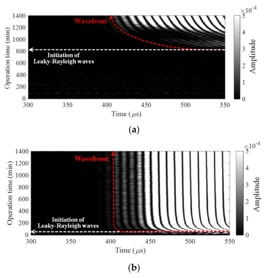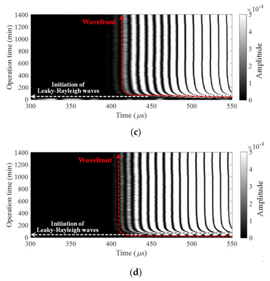 The set of obtained signals by the first sensor among the array during the hydration reaction (called operation time in the vertical axis) is visualized in Figure 8. The images clearly show the initiation of leaky Rayleigh waves and the increment of the wavefront during the operation time. On top of the images, the initiation and the increment are marked by white and red dotted lines, respectively. The two important parameters were easily obtained by a 25% amplitude difference between the noise level and oscillation. Using simple visualization of the data, the setting and hardening behaviors of cementitious materials can be identified.