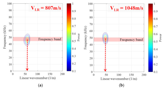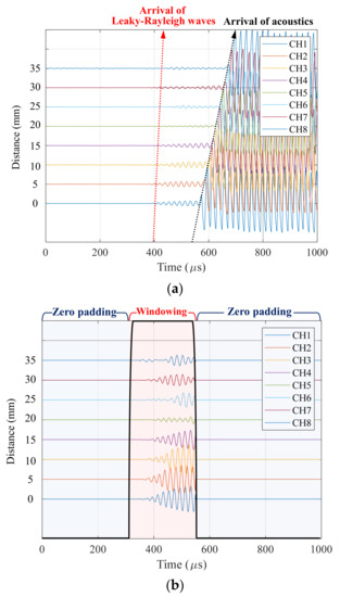 To improve the accuracy of data analysis and extract velocity information objectively, the phase difference of eight signals was calculated in the frequency-wave number domain. After high-pass filtering, only the leakage portion was extracted using the Tukey windowing function. Zeros were added to maintain the same length as the original data, as presented in Figure 9b. Then, a two-dimensional Fourier transform was applied to the data as follows: