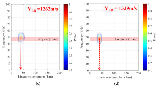 Examples of frequency-wave number domain analysis at different states of OPC 0%, showing operation time at (a) 860 min, (b) 1000 min, (c) 1200 min, (d) 1400 min.