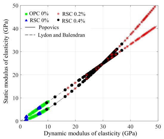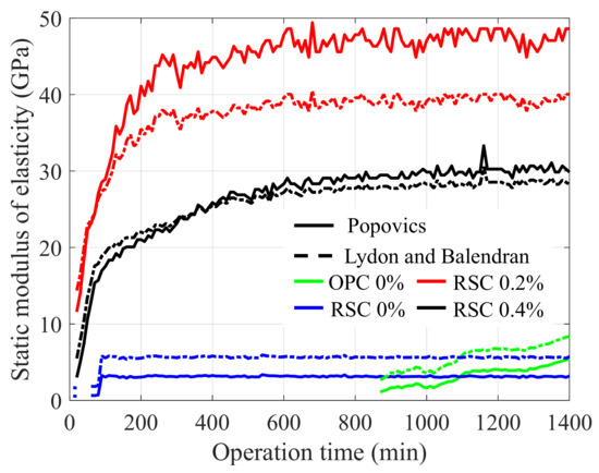 Figure 12 shows the relationship between the dynamic and static modulus of elasticity by the two models, and our experimental data measured over 24 h were added to the theoretical lines. Finally, the monitoring results presented in the static modulus of elasticity for all the specimens are shown in Figure 13. The moduli are presented in the range suggested by the two models. In the case of RSC 0.4%, the range does not vary as considerably as the one in the other specimens because the modulus was developed around the crossing point (30 GPa) between the two models. Based on these results, it is confirmed that the RSC mortar produces an elastic modulus of approximately 40–50 GPa within 24 h if the proper dosage of retarder is added. Compared to the modulus of fully hardened OPC paste, known as 30 GPa [22], the RSC is demonstrated to be an effective repair material. At the same time, the use of a retarder is an important factor in RSC for delaying setting, and also for modulus development during the hydration reaction.