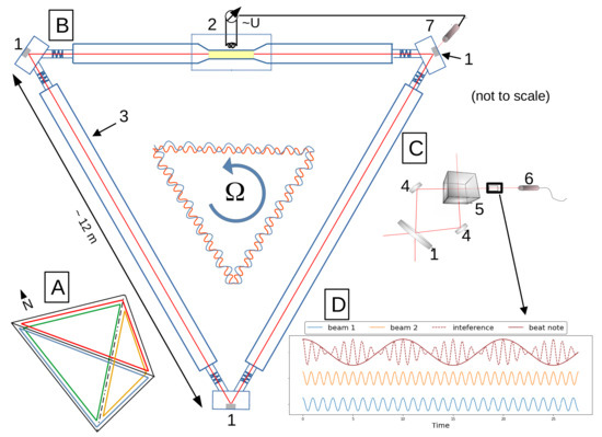 ROMY abbreviates ROtational Motions in seismologY and represents the only existing four component large-scale ring laser array, unprecedented in its design and scale [17,18]. It was constructed in 2016 at the site of the Geophysical Observatory in Fürstenfeldbruck, Germany. The setup and working principle is schematically shown in Figure 1. Each component is realized as an equilateral, triangular ring laser with approximately 12 m side length and arranged to form a downward pointing tetrahedron. The evacuated resonant cavity of each ring is filled with a helium-neon gas mix. Laser functions are established with radio frequency excitation of a plasma at the gain tube (see Figure 1B). Three low-loss super mirrors form a closed optical beam path. In order to make the instrument highly sensitive [11], the cavity is designed for minimal loss.