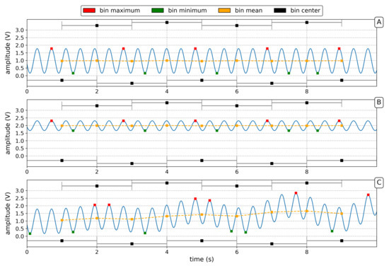 Schematic example of the quality measure computation for: (A) Single-mode, high-contrast signal; (B) A single-mode, low-contrast signal due to mode competition effects; (C) An appearing multimode operation state. Shown are synthetic signals for 2 s windows with exaggerated amplitude variations and reduced frequency for demonstration purposes. Mean (orange), maximal value (red) and minimal value (green) is calculated for each bin as well as an estimate of the frequency based on zero-crossings (not shown). Bins with 50% overlap are indicated (black).