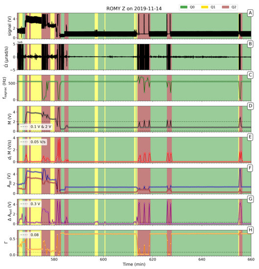 Selected data section of ROMY’s z-component on 2019-11-14. (A) Raw beat note signal; (B) Obtained rotation rate (clipped at ±5μrad/s); (C) Estimated Sagnac frequency; (D) Mean values M; (E) first-order finite-difference of M; (F) Median of maximal and minimal amplitudes ; (G) Maximal variance of peak-to-peak amplitudes ; (H) Calculated contrast value . Quality evaluation thresholds are indicated as grey, dashed lines. The background colors correspond to the classified quality level.