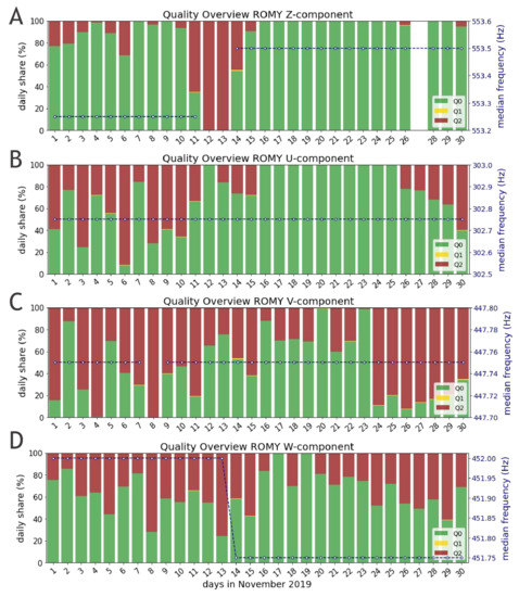 Furthermore, the scheme was applied to data of all four components of ROMY for November 2019. During this period an active field experiment was conducted at the site of the observatory, for which ROMY served as a reference station and all four rings were operating. Panels A–D of Figure 4 display the daily share of all quality levels across November 2019 for each of ROMY’s four components Z, U, V and W, respectively. Apart from a data gap on 27 November and maintenance work between 11 November and 14 November, the z-component demonstrates the best performance in terms of percentage and continuity of Q0 data. Here, the slanted rings confirm an increased vulnerability to optical frequency drift effects and underline a currently missing long-term stability. Overall, Q1 quality accounts for only a small share. The median frequency estimates shown in Figure 4, based on Q0 and Q1 data only, remains stable within a tolerance of Hz, while the frequency offset for the z-component is related to maintenance work. The corresponding contrast for the z-component included in Figure 5A, being on an overall low level (≈0.2), shows a further decrease before maintenance was required due to drift effects that could not be automatically recovered.