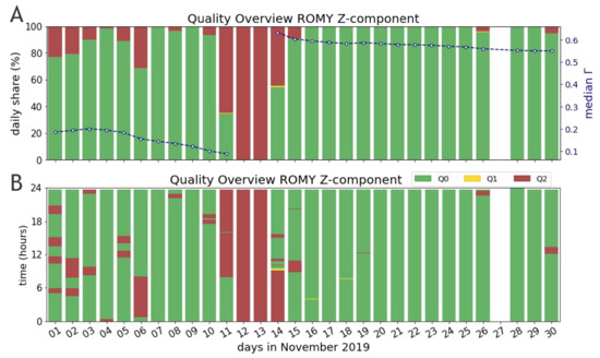 Figure 5 shows the evaluated data of ROMY’s z-component for the entire month of November 2019 not only by daily shares but also resolved temporarily across daily hours. Such a temporal visualization demonstrates the distribution of data sections with compromised operation states and subsequently the potential of a selection of a time series with good quality only. While several failures interrupt a stable performance of the instrument at the beginning of November, a continuous record of Q0 data is significantly improved for the second half of November.