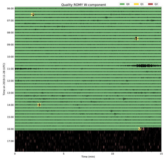 Six hours of data of ROMY’s w-component on 28 November 2019 are shown, including a regional event in Albania (Mw = 4.7) at 10:52:43 UTC. The rotation rate record is mean corrected, bandpass filtered (0.1 to 1.0 Hz) and clipped. Background colors indicate assigned quality levels for 20 s intervals.