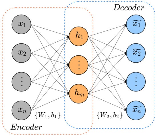 where , , and are weight matrices and bias of the encoder and decoder, respectively. Terms f and g are the commonly used activation functions sigmoide or ReLU [46].