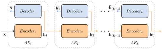 A deep structure able to learn high-level features is conceived by stacking several AE, and thus each AE is an SAE layer. As shown in Figure 2, the stacked autoencoder (SAE) uses the previous layer output to feed the next layer input. Two stages compose the SAE training, unsupervised pre-training and supervised fine-tuning. In the unsupervised phase, the pre-training layer-by-layer minimizes the reconstruction loss function Equation (6). In contrast, the supervised fine-tuning optimize all SAE parameters through prediction error minimization [48,49].