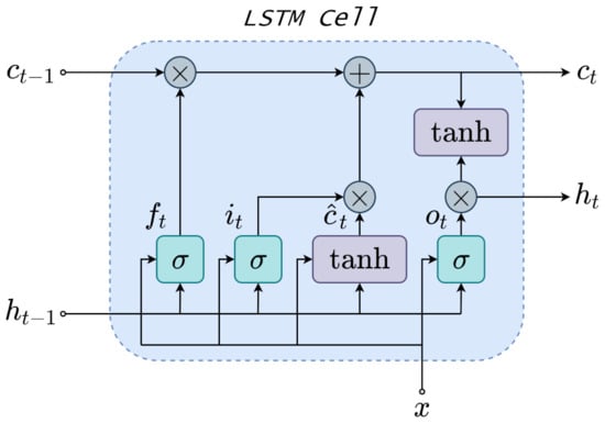 The Figure 3 illustrates a detailed LSTM cell, which present three gate controllers namely the input , forget , and output gates. The three gates decide the information that should be remembered or not, and represent their activation function. For the basic LSTM unit in Figure 3, external inputs are the input vector x, previous hidden state , and previous cell state . An intermediate state is generated inside the LSTM, which is part of computation of the current cell state . The LSTM model aims to obtain a latent variable to provide valuable dynamic information. To cope with this issue, LSTM gates are developed. The input gate of the LSTM cell is given as follows: