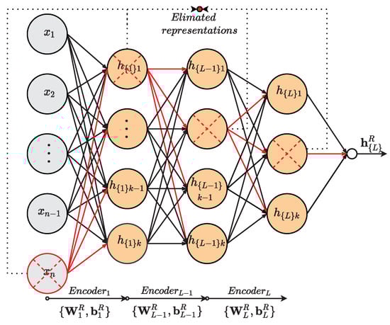 - As hidden representations of first AE are computed, MI evaluation is performed to remove irrelevant representations and retain important information only. By using , hidden representations are calculated to perform MI analysis. The MI between each representation and the corresponding target-output is evaluated: . According to MI values, the procedure wipes out the respective lines of data in the weighting matrix and bias that corresponds to non-relevant hidden representations, generating a new parameters set . Then unimportant representations are eliminated while meaningful representations are kept and used as input of the second AE.