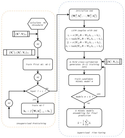 Figure 5 illustrates the summarized procedure to build proposed method MISAEL. In the unsupervised pre-training phase, an MI-SAE trained layer-by-layer until the L-th layer. MI analysis eliminates irrelevant information and, consequently, keeps relevant representation for each layer of the SAE. Moreover, an LSTM network couples to the tail of the acquired MI-SAE. The supervised fine-tuning of the entire deep architecture is performed by using a k-fold cross-validation strategy. Thus, k candidate MISAEL models are created, and then their output is aggregated to constitute the output.