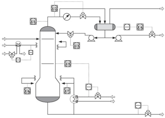 Debutanizer columns are applied for desulfurization and naphtha cracking in an industrial refinery. A debutanizer column attempts to withdraw propane (C5) and butane (C4) from the naphtha stream [60,61]. Process performance improves when butane content is reduced, and then high-quality naphtha final products are acquired. However, hardware sensors are not able to measure butane content in real-time. As an option, soft-sensing is an interesting approach to infer butane concentration online. Figure 6 illustrates the primary flowchart of the debutanizer column used in this work. The main devices are the heat exchanger, head reflux pump, bottom reboiler, overhead condenser, head reflux pump, feed pump to the splitter, and reflux accumulator. In Figure 6, gray circles indicate the several hardware sensors that measure the process quality variables on the plant. The described debutanizer column aims to eliminate C3 and C4 from the naphtha stream. By minimizing the C4 concentration in the bottom of the debutanizer, product quality improves. However, gas chromatographs measure C4 concentration, and they do not provide online C4 concentrations for real-time control due to interval delays. As an alternative, soft sensors can handle difficulties in real-time measurements, providing real-time estimations of C4 concentration for real-time process control. In [3], process dataset is available as well as further details.