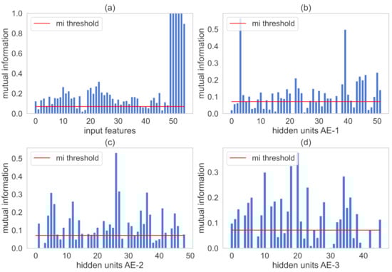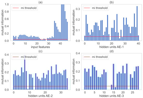 Figure 7 illustrates the calculated MI values for the representation of the AE where the red line is the value. MI values between input and the output variables are plotted in Figure 7a. The MI values among hidden representations of each AE and the output are plotted in Figure 7b–d, respectively. Variables are retained in the respective AE structure when its calculated MI values are greater than .