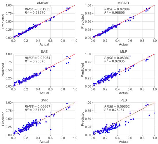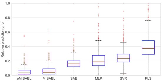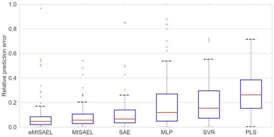 The prediction results using the testing dataset are illustrated in Figure 12 by the use of parity plots. As predictable, eMISAEL and MISAEL show higher efficiency than the other studied soft sensors. The relative prediction errors are plotted in Figure 13 with six boxplots representing eMISAL, MISAEL, SAE, MLP, SVR, and PLS in ascending order, respectively. As in the first study case, the central red mark represents the median value, and the edges indicate the 25th and 75th percentiles. The “whiskers” represent maximum and minimum no outlier values. The wider the width of the box, the more dispersed prediction errors are. As the best models, eMISAEL and MISAEL are the models with the narrowest box ranges mainly because MISAEL extracts non-linear features from massive unlabeled data, retains only the relevant representations, and addresses process dynamicity. A few outliers are individually represented by red points in Figure 13, considering inherent industrial uncertainties [63]. High relative prediction errors result from inappropriate soft sensors due to both adverse initial parameters and outliers. Through, a satisfactory soft-sensor gives stationary relative prediction errors on the same data. Therefore, stationery predictions can reflect the robustness of the model [64]. MISAEL extracts non-linear features from massive unlabeled data, retains only the relevant representations for soft-sensor development, and addresses process dynamicity. Equal to the first study-case, MISAEL and eMISAEL implement a soft-sensor with improved performance, enhanced reliability, and stronger robustness.