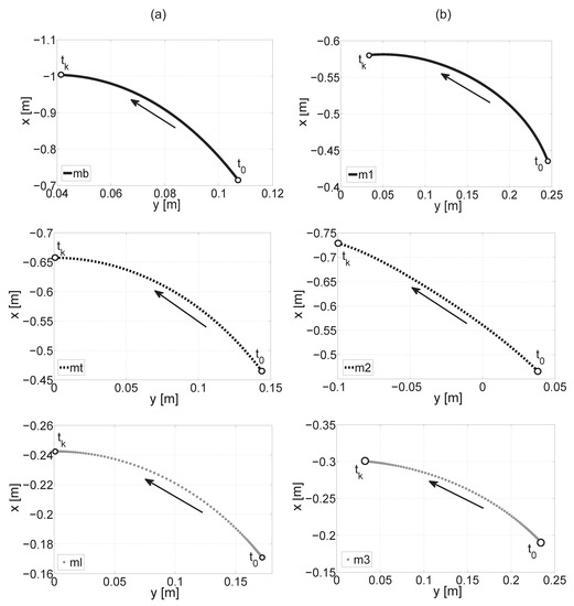 The movement trajectories of mass centers of the trunk, thigh, shank, and actuators 1, 2, and 3 are shown in Figure 2. Equation (4) was applied in order to determine the trajectory, where —initial position (squat), —standing position. The arrows indicate the movement direction of mass centers in relation to the coordinate system origin. The highest value of displacement on the x-axis can be observed for the trunk and its value is −0.28 m. The highest value of displacement on the y-axis occurs for actuator 3 which drives the ankle joint and its value is . The lowest value of displacement on the x-axis can be observed for the mass center of the shank, its value is —this fact is logical because the distance from the origin of the coordinate system is small.
