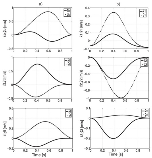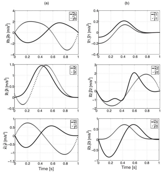 Value variations of angles, velocities, and accelerations for joints (a), variations of displacements, velocities, and acceleration for actuators which drive the individual joints (b).