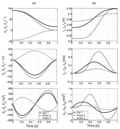 The component values of angles, velocities, and angular accelerations for single joints during a change in position from squatting to standing upright in 1s are shown in Figure 5a. The displacement, velocity, and acceleration of actuators that drive the joints are illustrated in Figure 5b.