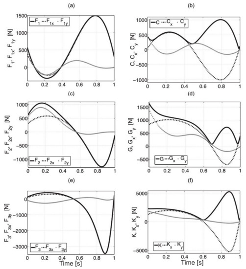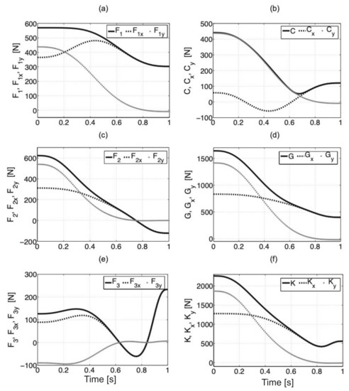 Force values (a), (c), and (e) with components x and y, reactions with components x and y for hip joint (b), knee joint (d), and ankle joint (f).