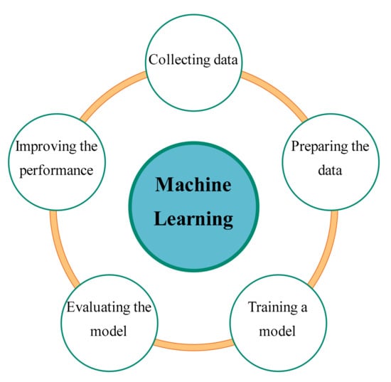 Machine learning [18] is a subset of artificial intelligence in which computers can learn without being explicitly programmed. It is related to the development process of computer systems in which they can make intelligent decisions in response to new data based on previously gained experience. Figure 2 shows the main steps in machine learning systems. Collecting raw data is the first step of a machine learning system. The data preparation phase determines the quality of data applied in analytical processes. An appropriate learning model is selected and trained in the next phase. The evaluation phase determines the performance of the selected learning model. Finally, the feedback from the evaluation phase is used to improve the model efficiency or replace it with another model. SML [19,20] is one of the machine learning algorithms in which the learning model is trained using a pre-defined training set to improve the accuracy of the decision-making. The linear regression model is a fundamental SML algorithm with two parameters that can be represented as,