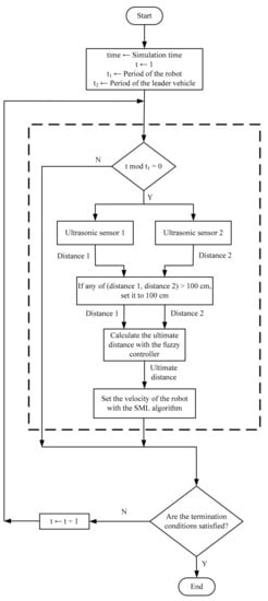 Assume a two-robot leader-follower formation control scenario, where the follower robot steers to maintain a formation with the leader robot. Two ultrasonic sensors, installed on the forward motion direction of the follower robot, continuously measure its distance to the leader robot. Figure 3 shows the workflow of the proposed technique for the speed control of the follower robot. The technique consists of a fuzzy controller and an SML algorithm to specify the ultimate distance to the leader and the speed of the follower, respectively, in order to maintain the formation with the leader robot. The leader robot changes its speed every seconds to a random value that is unknown to the follower and subsequently the follower robot adjusts its speed every seconds.