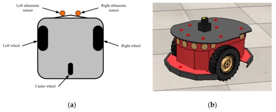 Differentially driven mobile robots are very common robot models used for theoretical and experimental studies. The specific mobile robot selected for the proposed speed controller technique implementation was the Pioneer 3-DX [21] (Figure 4). This robot model was employed for the experimental studies in the V-REP robot simulator discussed in Section 4. We have used only two sonars installed in the front of the robot to detect obstacles (here, to detect the leader robot).
