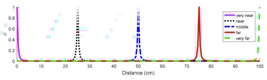 The fuzzy controller consists of two input parameters, namely ‘Distance 1’ and ‘Distance 2’, and one output parameter, namely ‘ultimate distance’. The linguistic terms of all the parameters are specified as {very near, near, middle, far, very far}, and their universe of discourse is determined as {0, 1, …, 100} cm. Since the follower navigates in the highest velocity when the distance between the leader and the follower is equal or greater than 100 cm, we considered that it has the maximum value in the universe of discourse. That is, the distances greater than 100 cm will be considered equal to 100 cm. Membership degrees of all the linguistic terms and quantitative amounts are determined by the bell-shaped membership function [22] as follows: