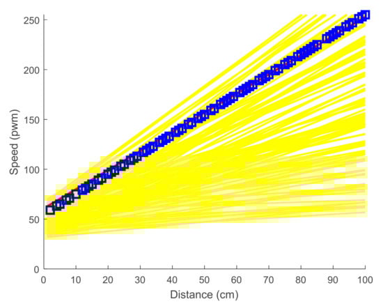Table 2 presents some data in the training set that is determined in the controller to find all of the possible solutions to regulate the speed of both DC motors. The distance is in the range of [0, 100] cm, and the speed is in the range of [0, 255] PWM which later is converted to an actual value as m/s. The main algorithm to determine the best solution can be given by linear regression, as below: