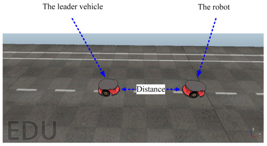 The performance of the proposed technique for the speed control was evaluated under different conditions based on a case study that used the Pioneer 3-DX [24,25] to navigate two robots on a road between two positions. Figure 7 shows a schematic of the simulation scenario. The length, width, and height of the robot were 485 mm, 381 mm, and 217 mm, respectively. We used scalability around 70% of the real robot in the simulations. The simulation process was performed using an integration of MATLAB and V-REP in which the model was considered in the V-REP simulator and the robot’s speed was regulated in the MATLAB environment. The robot’s speed was determined in the periodic time t1 while the leader vehicle’s speed was specified in the periodic time t2. The default values of t1 and t2 were considered as 2 s and 5 s, respectively. Note that max indicates the maximum speed of the leader vehicle.