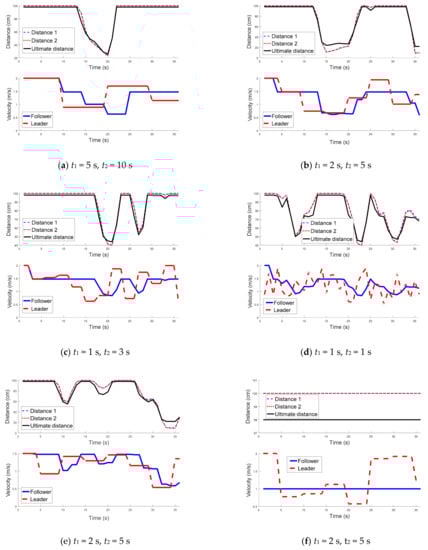 Figure 8 shows the performance of the proposed technique under various assumptions of time parameters t1 and t2 as well as velocities of the leader. As can be seen in the results, when the leader changed its speed to a random value, the follower’s velocity controller could regulate the follower’s velocity properly, so, the formation was maintained without collision between the two robots. Furthermore, the time histories of the follower’s velocities showed relative smoothness that provided for stable motion. Figure 8f illustrates that when the follower’s speed was constrained to be less than 1 m/s, the controller steered the robot with the maximum speed to keep the formation.