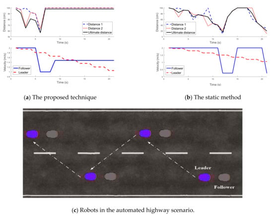 To compare the proposed technique with a static method under an automated highway scenario, the robots were considered to move down a two-lane road (Figure 9). The leader robot decreased its speed from 2 to 0.5 m/s gradually while in the static method the follower robot adjusted its speed as