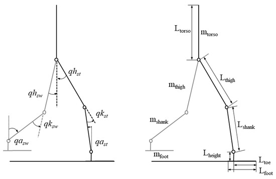Stick diagrams of the bipedal robot changed from the initial position to the beginning position of push-off are shown in Figure 3. The hip and knee positions are denoted by qhsw and qksw and defined by Equations (16) and (17).
