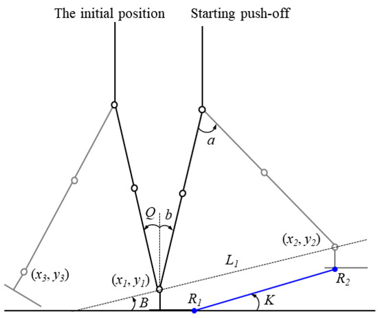 Initial position and push-off position. The black solid line indicates the stance leg, and the gray solid line indicates the swing leg.