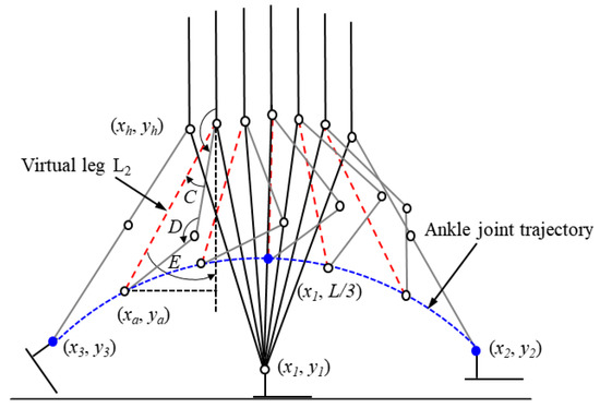 where L2 is the length of the virtual leg, C is the angle between the thigh of the swing leg and the virtual leg, D is the angle between the thigh and shank of the swing leg, and E is the angle between the virtual leg and the vertical line of the ground.