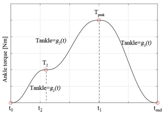 where R1 (xtoe, ytoe) is the toe position of the stance leg, and R2 (xsole, ysole) is the sole position of the swing leg. The torque curve for the ankle joint during the push-off phase corresponds to the process when the push-off angle changes from K to 0°. To simplify the target trajectory planning, the horizontal axis (t0, tend) of the planned curve of ankle torque is set to range from 0% to 100%. The push-off angle K then corresponds linearly to the planned ankle torque.